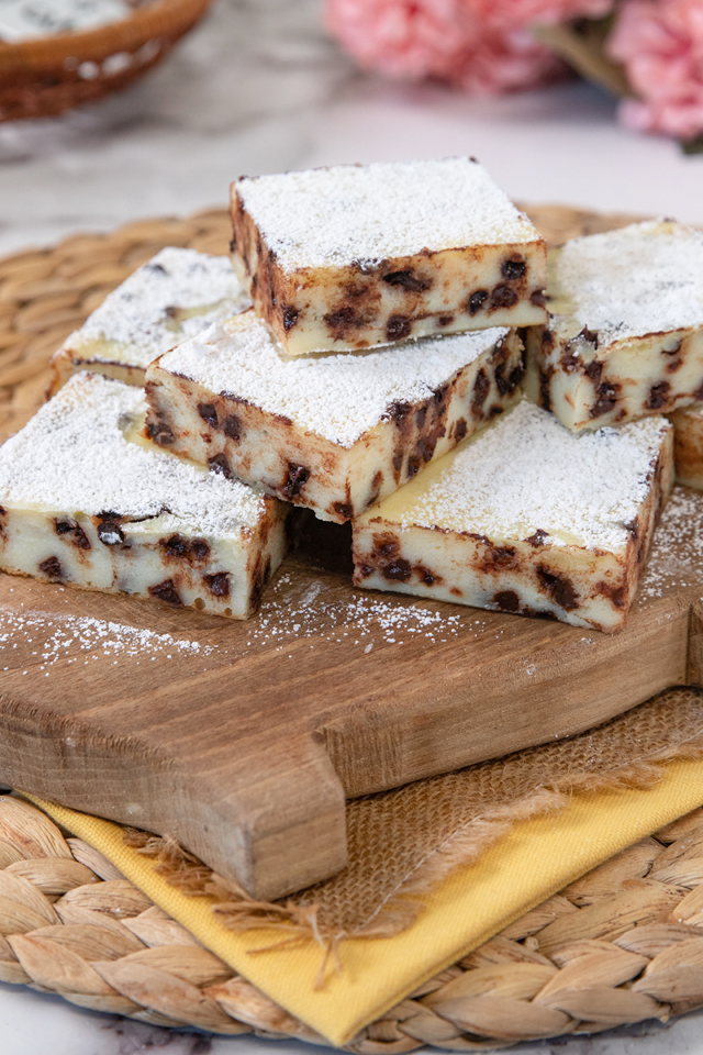 Io adoro servirla a quadrotti accanto al tè oppure al caffè, è anche un ottimo dolce per buffet di compleanno perchè somiglia ad una cheesecake o come dolce della domenica.